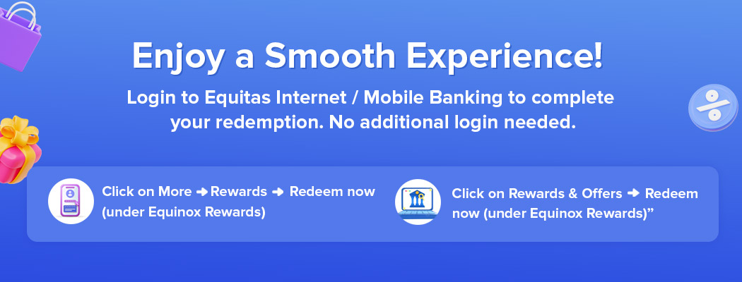 Shop, pay bills and more, online or offline, with your Equitas Bank Debit Card and earn Equitas Bank Points. Every time you swipe your card, you get points in your account that you can redeem later! Here's how redemption works: